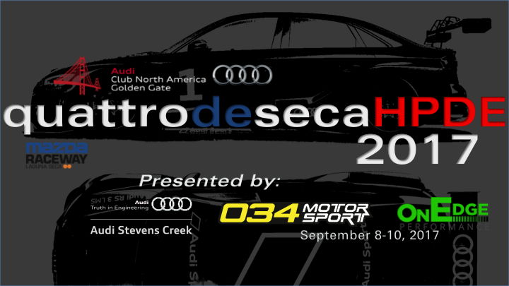 Welcome to the registration for "quattro de Seca 2017". This High Performance Driver Education event (HPDE) will be held Sept 8th - 10th at Mazda Raceway, Laguna Seca (MRLS) covering the 2.238 miles of a challenging track with 11 turns including the famous "Corkscew", a 5-1/2 story drop between turns 8 & 9. Our event is open to drivers at all levels of experience from beginner to expert. This event is subject to a sound limit of 92dB.