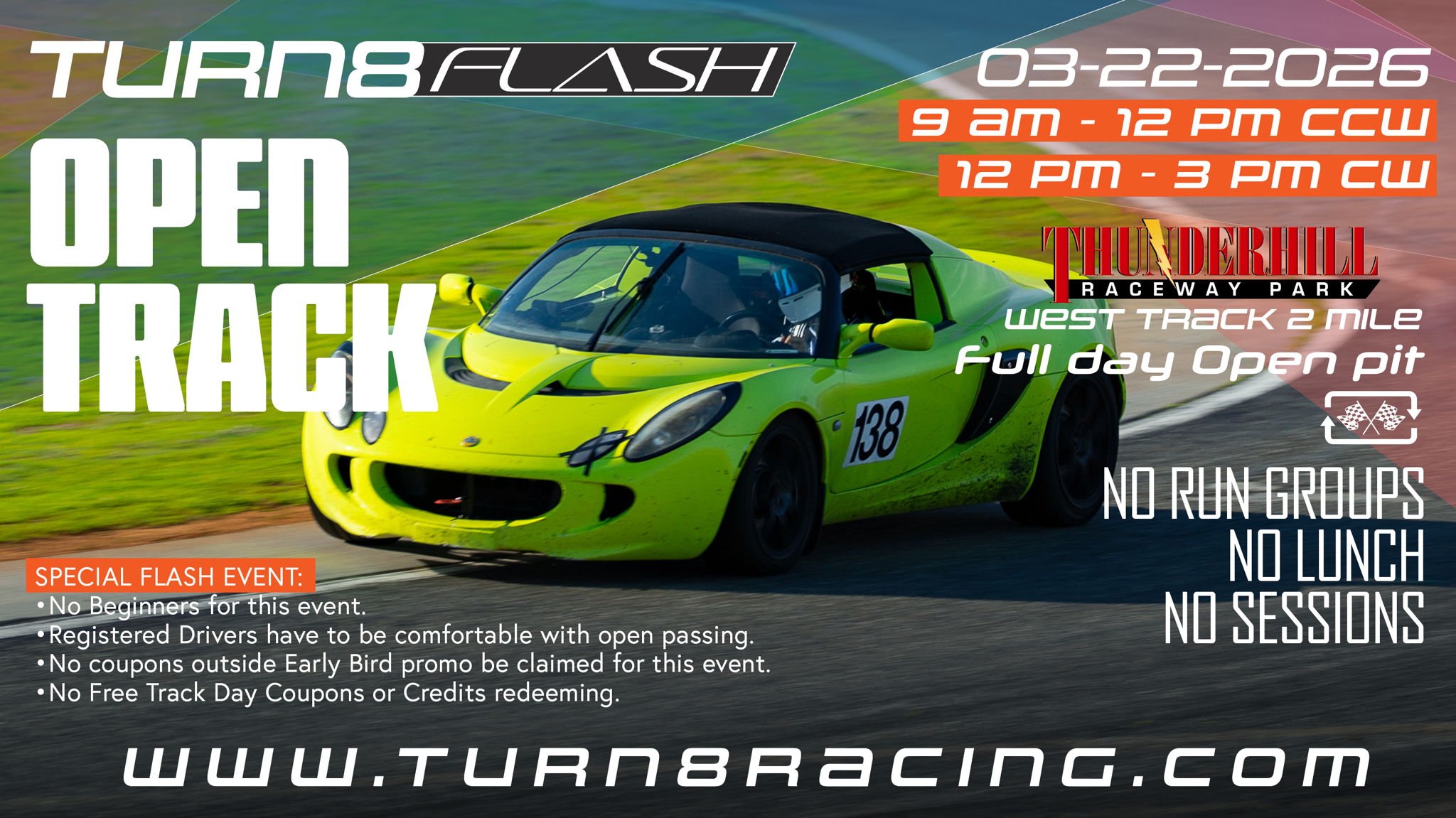 Turn8 Flash Event is the ultimate drive session for drivers chasing their personal bests and professionals looking for focused test-and-tune time. This event is not for beginners — participants must be fully comfortable with open passing and high-performance driving dynamics.
