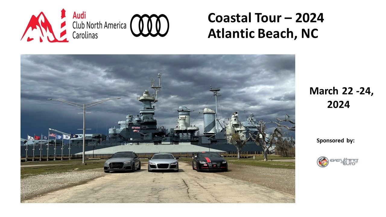 Audi Club - Coastal Tour 2024, hosted by Audi Club Carolinas, will take place Friday morning, March 22nd - Sunday afternoon, March 24th, 2024.