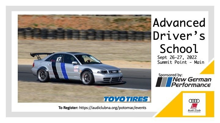 VEHICLE NOTE: You do not need to drive an Audi to participate in this event. Convertibles are only permitted IF approved safety equipment is installed. High center-of-gravity vehicles (e.g., SUVs, CUVs, etc.) are also restricted. Additional details, including pre-approved makes/models, are provided in the Driver School Event Rules. Open wheeled cars are not eligible to participate.