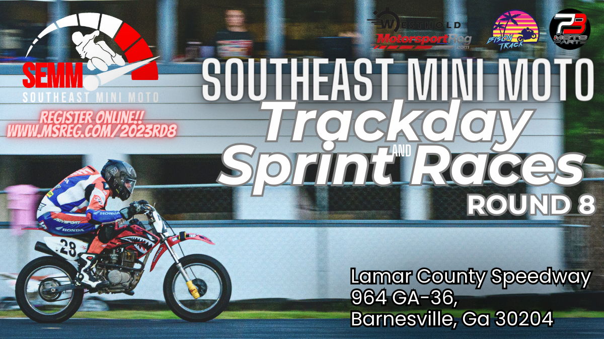ATTENTION IN THE PADDOCK!! Let's go first call for the 8th round of the 2023 Southeast Mini Moto Open trackday + Sprint Racing Series! Southeast Mini Moto will be holding the Open Trackday & Sprint Races at Lamar County Speedway. We have many classes available so there is a class for everyone! (we can and will make extra classes on the day of event if needed so don't leave your Fifty's at home!). Lamar County Speedway is utilizing the Westhold timing and scoring system for the event, both trackday and races. If you have your own transponder you may use that. If not, don't worry! We will have Westhold transponders for rental during both track day and races. The open trackday is for all ages and skill levels! The Racing is for all ages and skill levels.