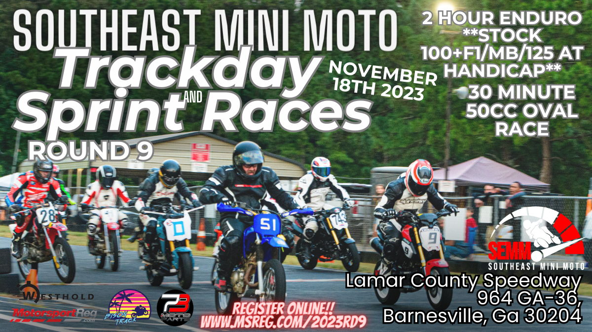ATTENTION IN THE PADDOCK!! Let's go first call for the 9th and final round of the 2023 Southeast Mini Moto Open Trackday + Sprint Racing Series! Southeast Mini Moto will be holding the Open Trackday & Sprint Races at Lamar County Speedway. We have many classes available so there is a class for everyone! (we can and will make extra classes on the day of event if needed so don't leave your Fifty's at home!). Lamar County Speedway is utilizing the Westhold timing and scoring system for the event, both trackday and races. If you have your own transponder you may use that. If not, don't worry! We will have Westhold transponders for rental during both track day and races. The open trackday is for all ages and skill levels! The Racing is for all ages and skill levels.