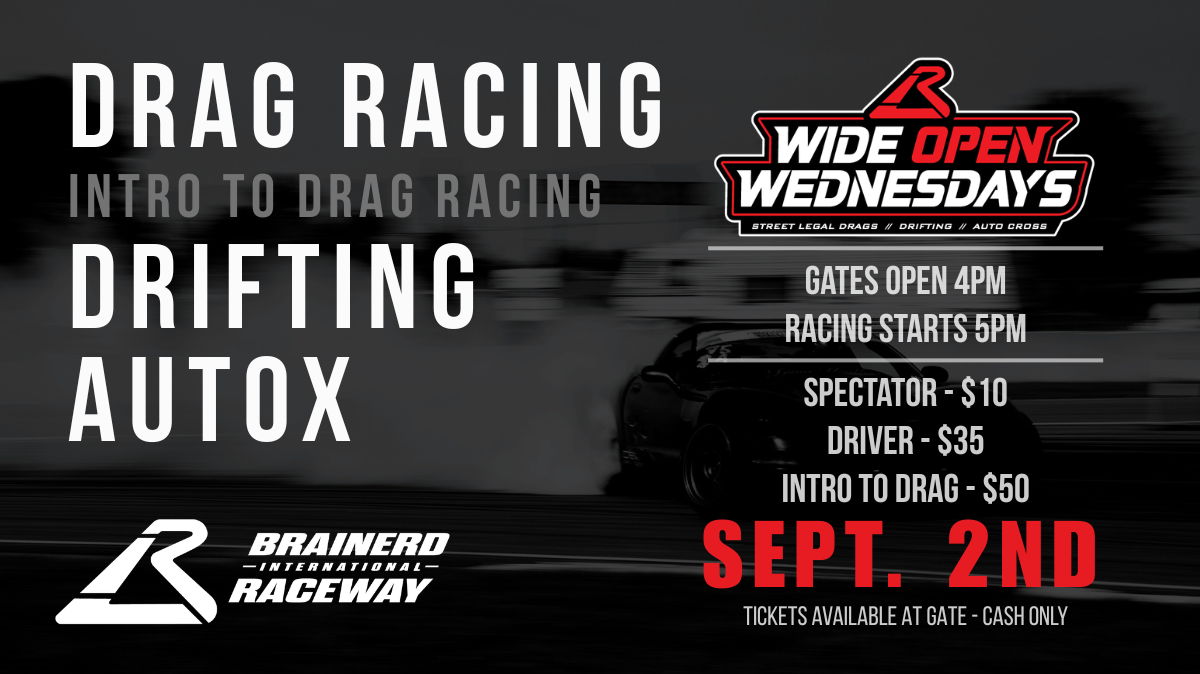Join us at Brainerd International Raceway for Wednesday Night Street Drags. Gates open at 4pm, racing runs 5pm to dusk. Open to street-legal cars, trucks, and motorcycles. $35 racer entry, $10 spectators (tickets at the gate). Use the Christmas tree, burn-out box, and scoreboard with live announcing. Vehicles must be OEM-based, street-driven, plated, insured, and meet highway safety requirements.