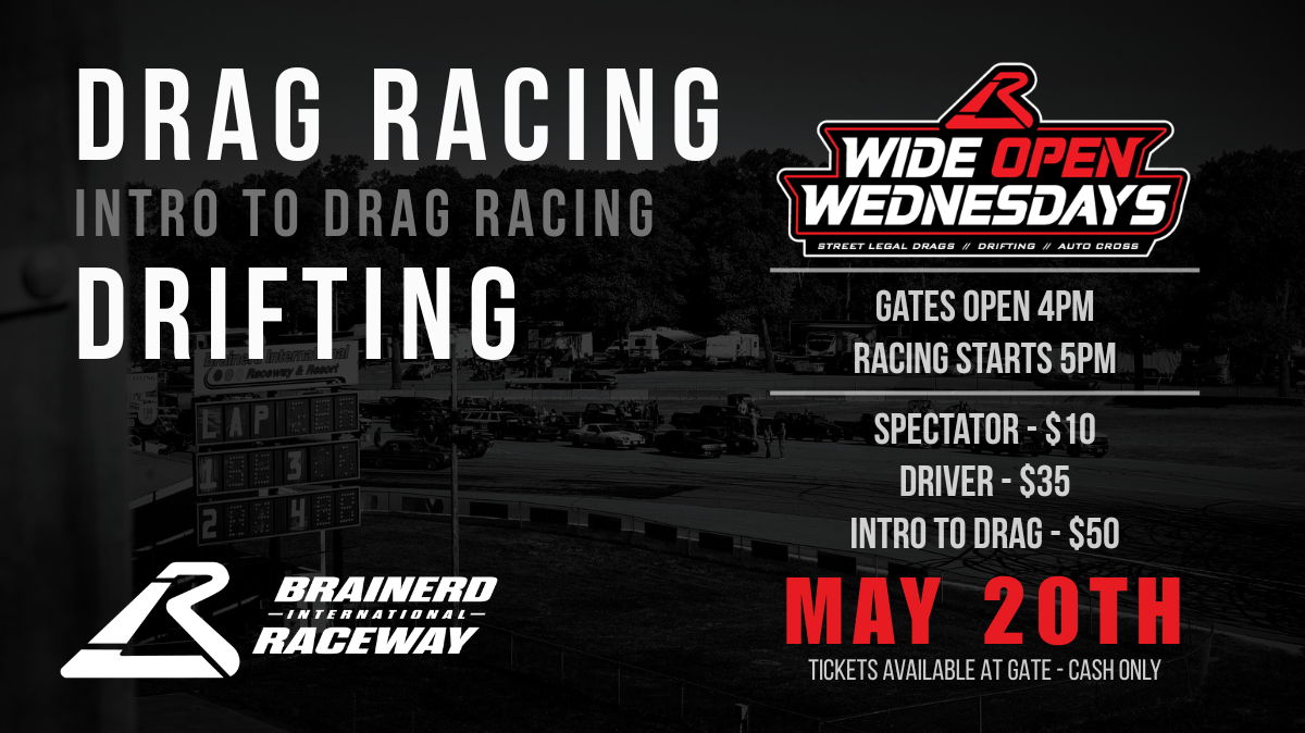 Join us at Brainerd International Raceway for Wednesday Night Street Drags. Gates open at 4pm, racing runs 5pm to dusk. Open to street-legal cars, trucks, and motorcycles. $35 racer entry, $10 spectators (tickets at the gate). Use the Christmas tree, burn-out box, and scoreboard with live announcing. Vehicles must be OEM-based, street-driven, plated, insured, and meet highway safety requirements.