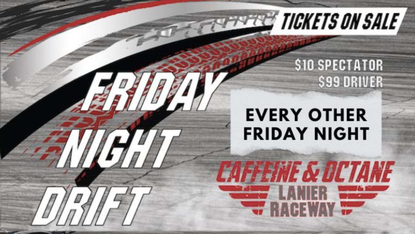 Join us for Friday Night Drift at the Caffeine & Octane Lanier Raceway! FND is held every other Friday Night & is a beginner-friendly event, but the drift course is set up to challenge even the most advanced drivers. Come out and support the grassroots drifting as a driver or spectator. Concessions are open & parking is free. Spectator view is perfect from the Grandstand! Catch the smoke show every other Friday night! Visit caffeineandoctane.com for all event details, driver registration, & ticketing.