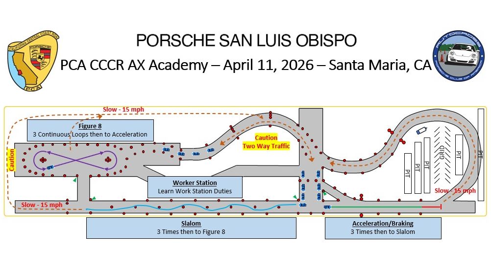 The California Central Coast Region of The Porsche Club of America (CCCR-PCA) is holding an Autocross School on Saturday, April 11, 2026.  Entry will be limited to 30 students. The Ground School will begin at 7:30 a.m. at the Santa Maria Airport Administration Office, which is located on 3217 Terminal Dr., Santa Maria, CA 93455. Parking in rear of building.  For PCA members, registration opens on 03/16/2026; Registration is open to all entrants on 03/30/2026.