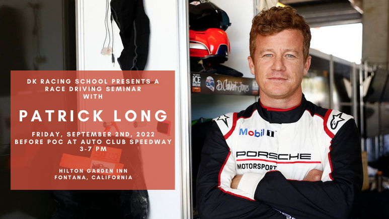 Join DK Racing School's Dwain Dement and Martina Kwan in presenting a Race Driving Seminar by Patrick Long. Experience the rare opportunity to listen to the mindset and psychology of racing from world renowned Patrick Long. There will be an opportunity for questions and answers and pictures and then Patrick will join us for our buffet style dinner.