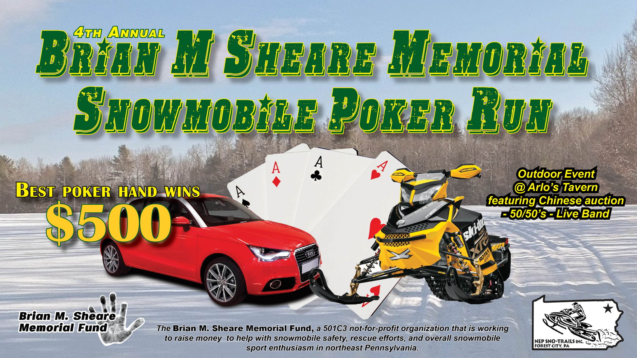 The Brian M. Sheare Memorial Fund, a 501C3 not-for-profit organization that is working to raise money to help with snowmobile safety, rescue efforts, and overall snowmobile sport enthusiasm in northeast Pennsylvania.