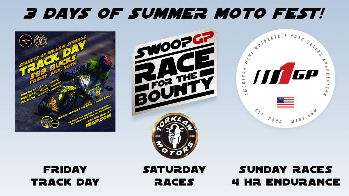NOTE FOR ALL RACERS - ALL race activity will be for EXPERIENCED RACERS ONLY, including the SWOOPGP - Race For The Bounty races on Saturday, and 4 hour endurance race on Sunday. All races will be under the sanctioning body of M1GP Motorcycle Road Racing Association. The M1GP rule book will generally apply for vehicles and safety gear with the exception of some exhibition classes to be announced.