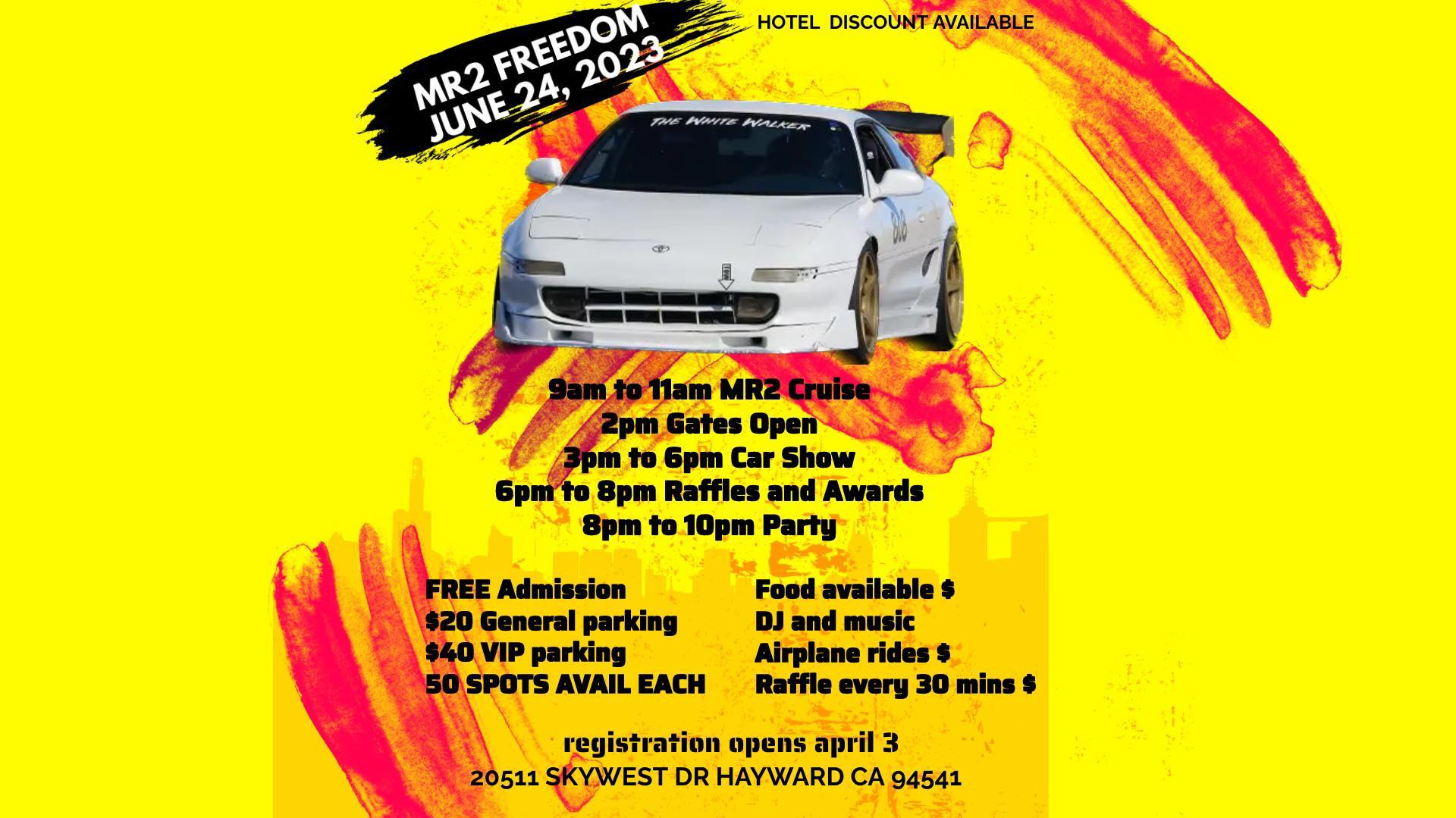 Open to the public. Participants are limited to 1984-1989 Toyota MR2, 1989-1999 Toyota MR2, and 1999-2007 Toyota MR2 Spyder. This is a private facility so let's act like adults and be respectful of the privilege we have to utilize this space. The better of an impression we leave on this facility the greater the chance that we can continue to use this in years to come. This means being respectful to the property, picking up after yourself, and no engine revering or burnouts. All MR2's are welcome to attend and partake in the event. General show parking is $20. After registering you will be sent a invoice from Mitch's Auto Parts for your spot to be reserved. You have 1 week to pay the invoice otherwise your spot will be forfeited to the next applicant.
