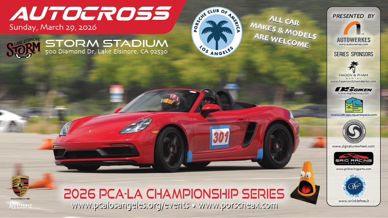 PCA Los Angeles invites you to come out and join us for the 5th event in our monthly autocross series. Our series has been organized by volunteers with a long history of running POC and PCA sanctioned autocross events. Autocross is a fun way to learn the basic handling dynamics of your car in a controlled environment.