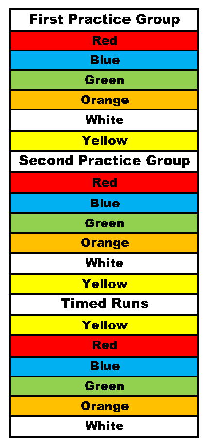 Registration Table: After Tech is complete, they will direct you to drive to the Registration table where you will turn in your completed Tech form, show your Driver's License and be given your Run Group sticker and wristband. Place your Run Group sticker on the top left corner of your windshield. Put your wristband on your left wrist for the Starter to easily see.