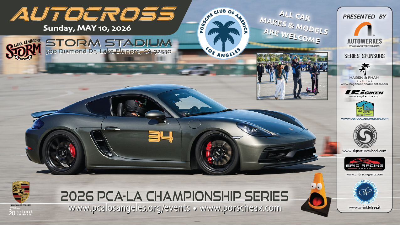 PCA Los Angeles invites you to come out and join us for the 7th event in our monthly autocross series. Our series has been organized by volunteers with a long history of running POC and PCA sanctioned autocross events. Autocross is a fun way to learn the basic handling dynamics of your car in a controlled environment.