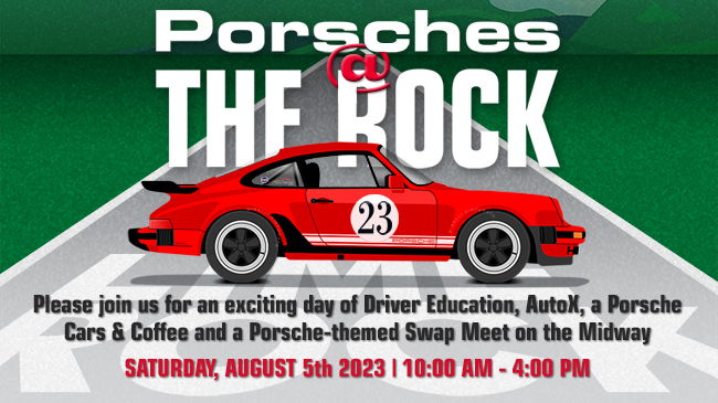 Please join us for an exciting day of Driver Education, AutoX, a Porsche Cars & Coffee and a Porsche-themed Swap Meet on the Midway. No registration or admission charges for watching and hanging out.