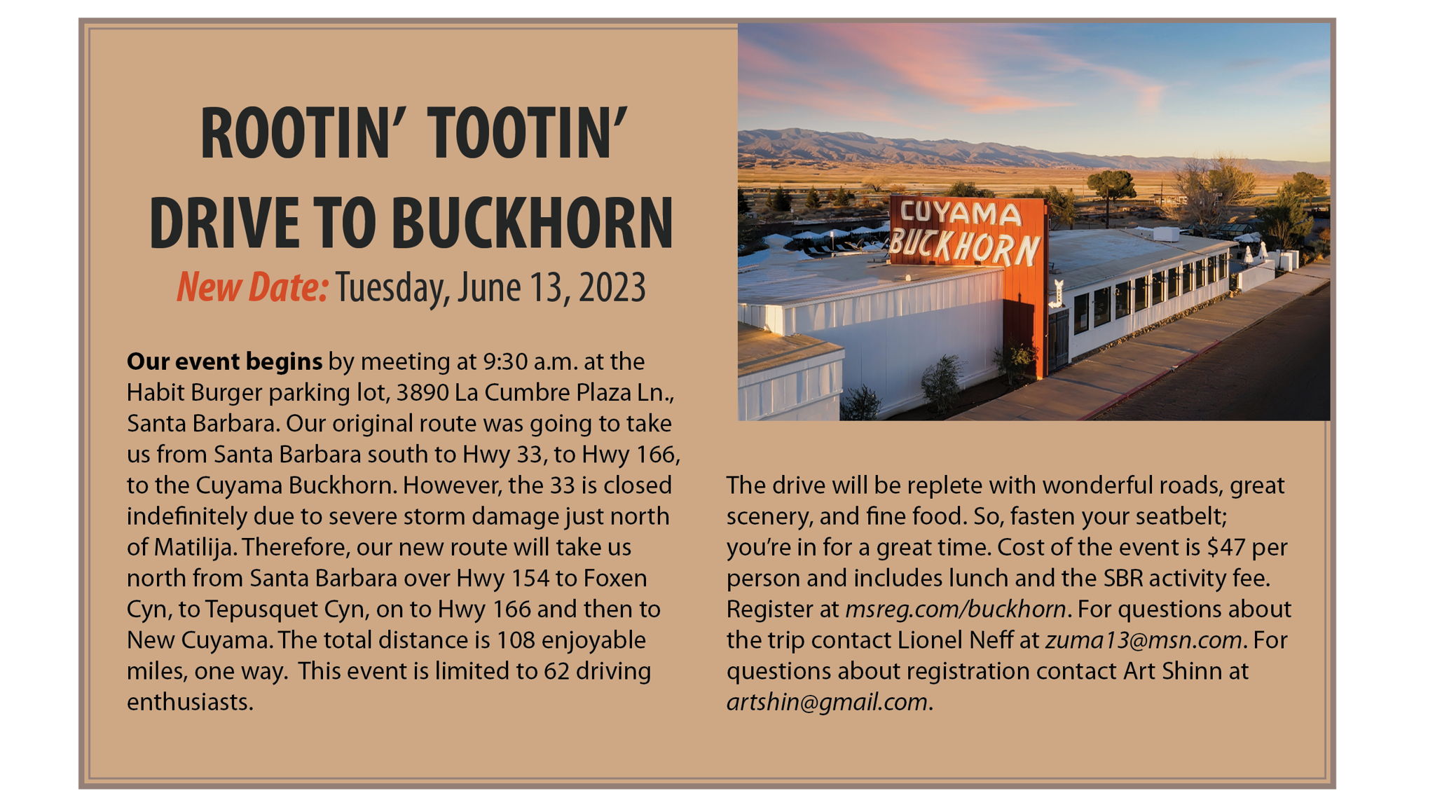 On June 13th we will meet at the Habit Burger in Santa Barbara. Our original route from Santa Barbara was going to take us South to Hwy 33, to Hwy 166, to the Cuyama Buckhorn. However, due to severe storm damage sustained to Hwy 33 just North of Matilija, the road is closed indefinitely. Therefore, our alternate route will take us North from Santa Barbara over Hwy 154 to Foxen Cyn, to Tepusquet Cyn, to Hwy 166, then to New Cuyama. Total distance 108 enjoyable miles. This event is limited to 62 driving enthusiasts. The drive will be replete with wonderful roads, great scenery, and fine food. So, fasten your seatbelt; you're in for a great time.