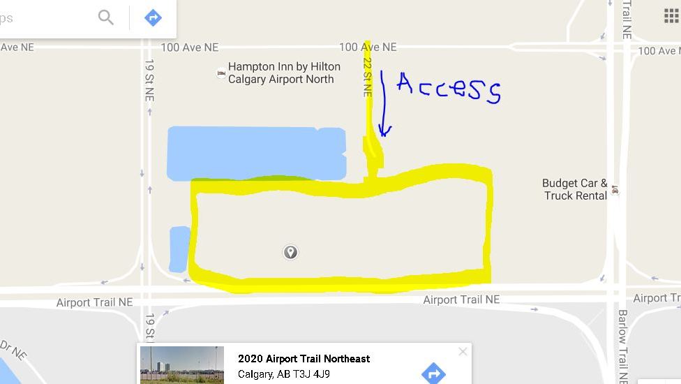 - Budget/YYC lot - 2020 Airport Drive NE (1 block from Hampton's Inn) access via 100th Ave. NE and go south on 22nd St. NE.