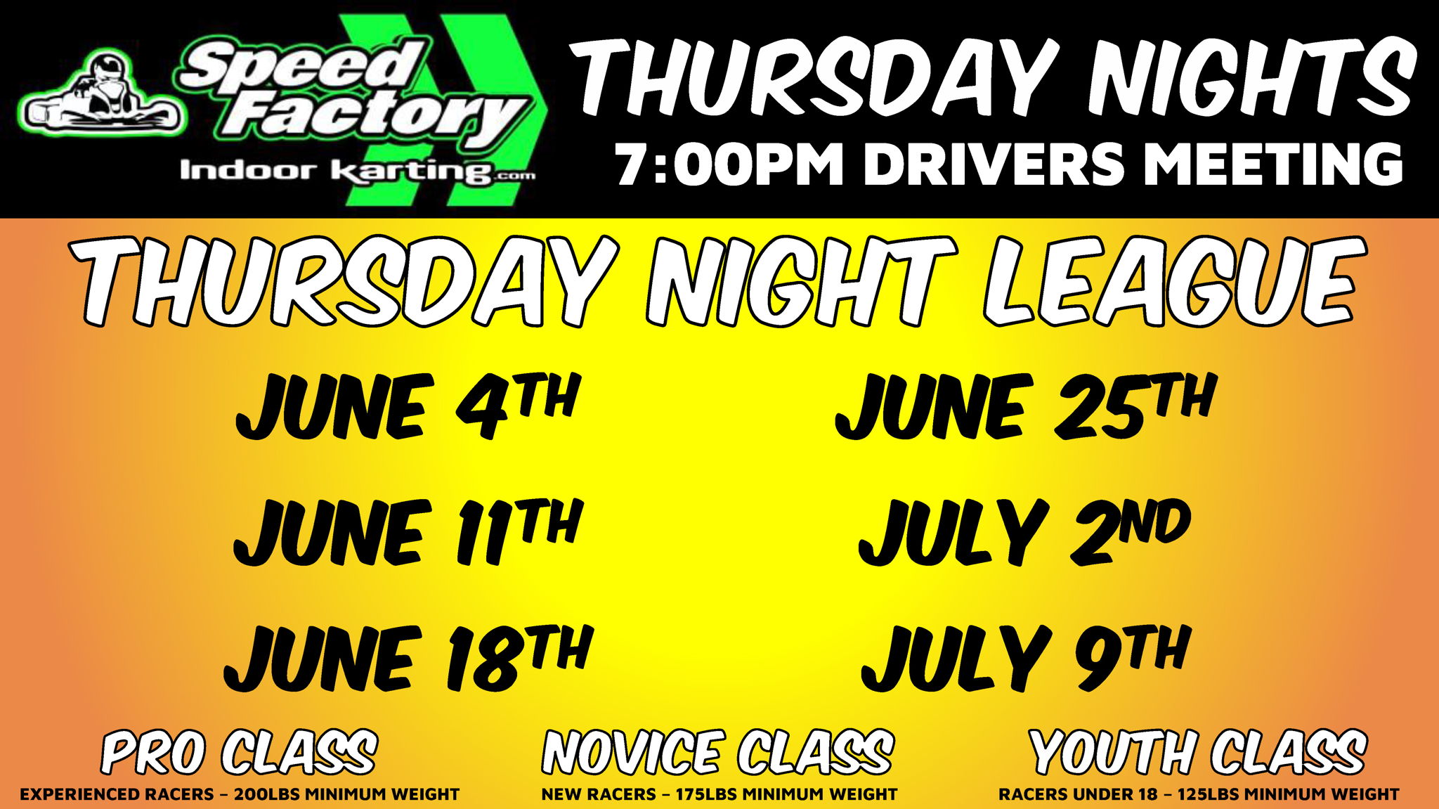 Speed Factory's Summer League will be our marquee league of 2026! With a Pro, Novice, & Youth class, we have a class for every skill level.