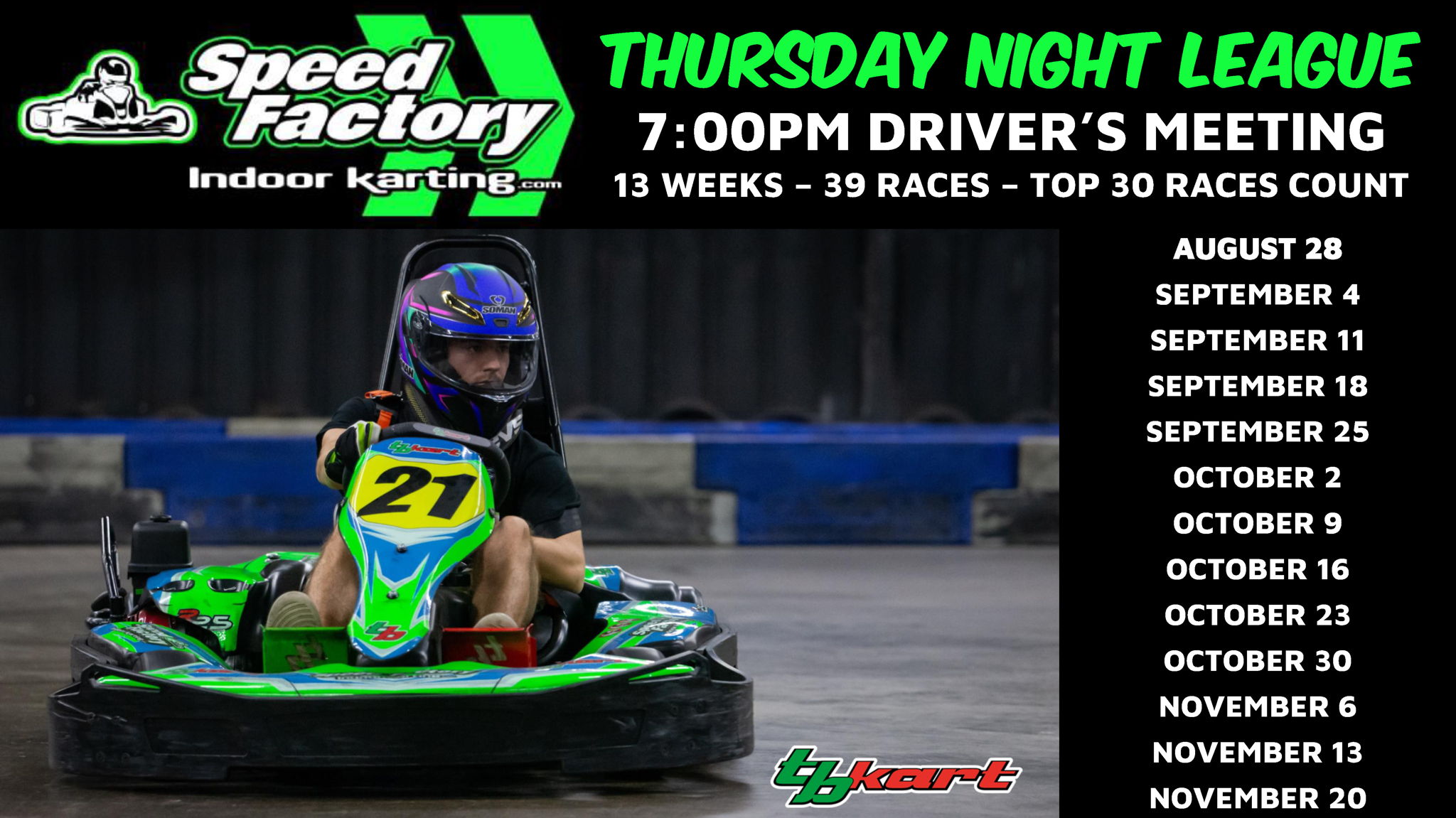 Join us for our Thursday Night League every week at 7:00pm! Our indoor kart track is located at 1524 Roper Mountain Road in Greenville, SC. The cost to enter is $59.99 and it includes 3x 20 Lap Races with a different kart for every race. All drivers will be weight balanced to 190lbs.
