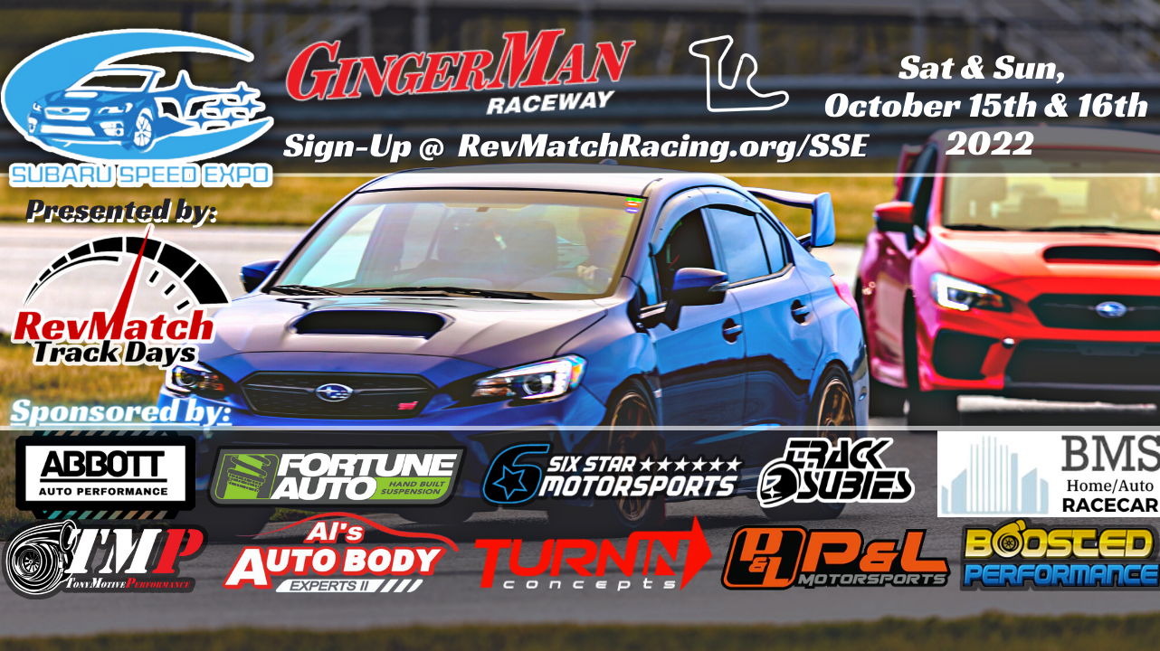 RevMatch is proud to present the fifth annual Subaru Speed Expo (SSE)! SSE is an HPDE (high performance driving experience) that will be hosted at Gingerman Raceway! This is an affordable way to get your car on a track with your friends!