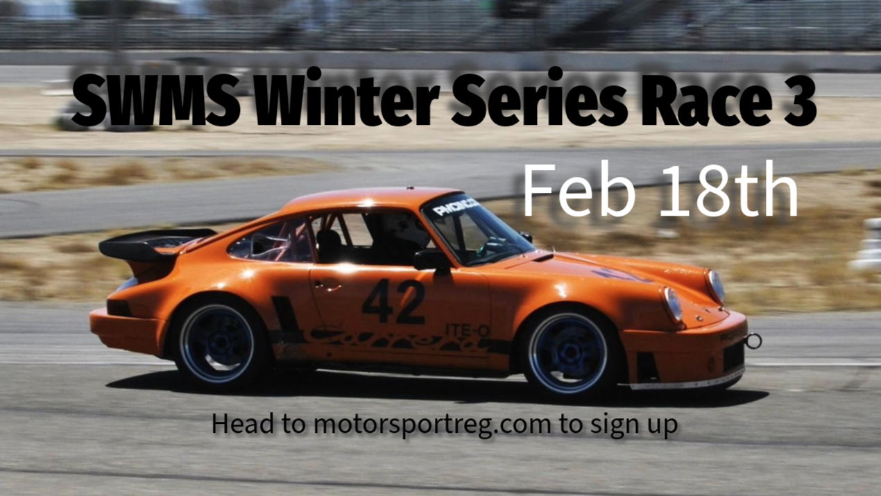 With the formal 2023 SWMS racing season concluded, sports car racing transitions to the Winter Series races! Join us on Sunday, February 18th, 2024 for the next Winter Series races. Continuing in the spirit of prior Winter Series races, the 2023/24 Winter Series will see an abbreviated schedule and a slightly later start time. The scheduling will be flexible and formalized during the driver's meetings, to adjust and best adapt to who is present. Winter Series races are a great way to get out and have fun during the off season, we hope to see everyone out at the track!