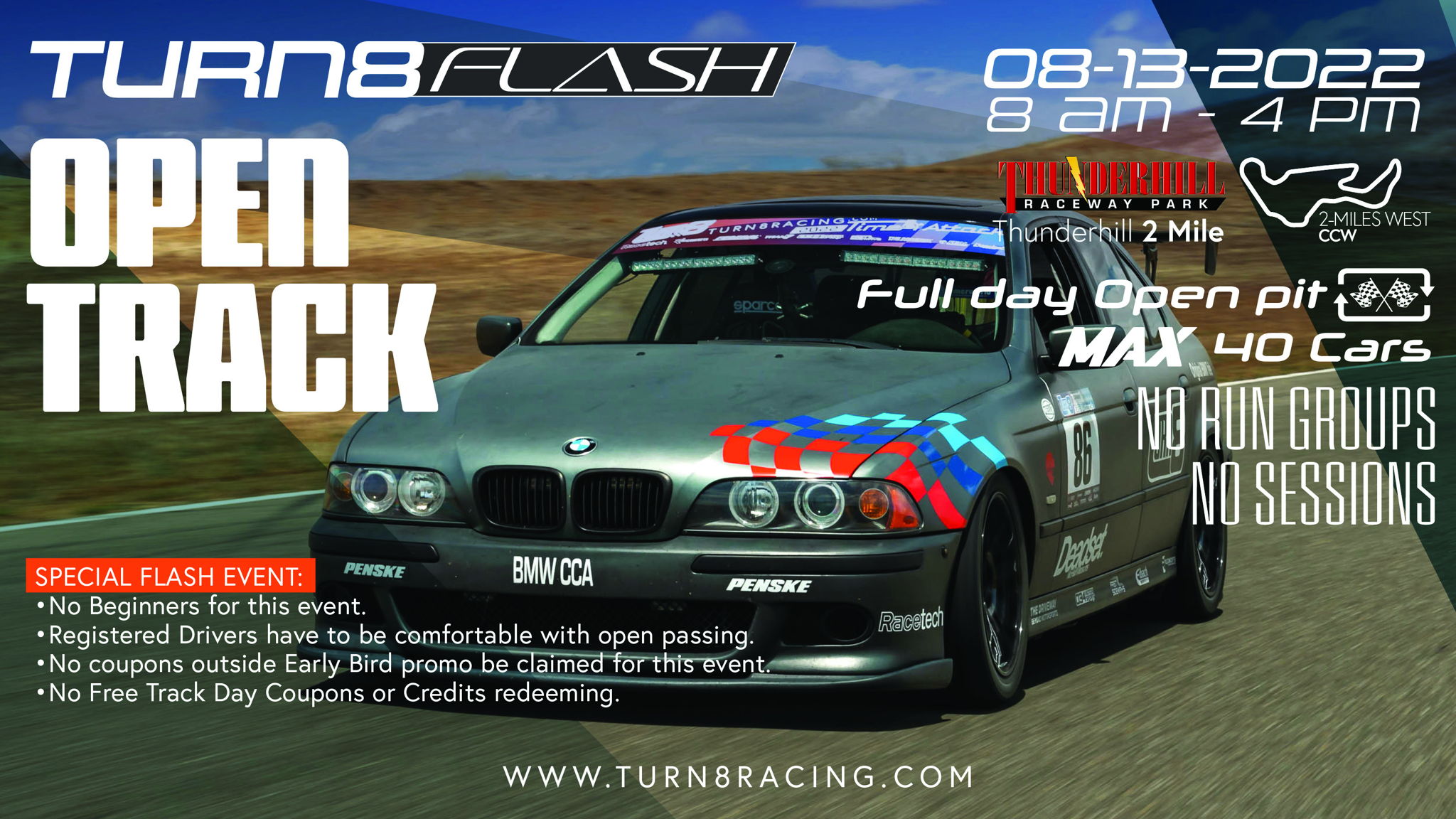 • No Turn8 Free track day / coupon/ credit will be accepted for Turn8 Flash labeled events.
