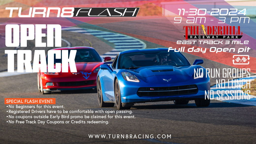 • No Turn8 Free track day / coupon/ credit will be accepted for Turn8 Flash labeled events.
